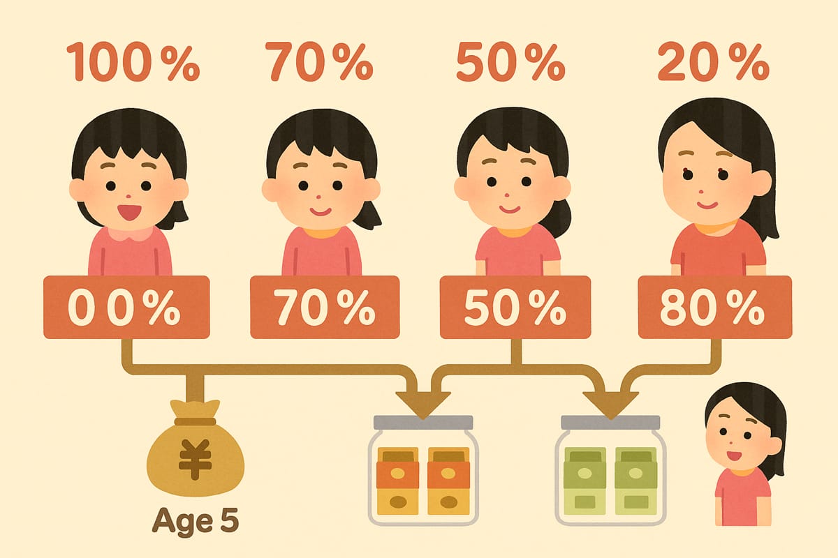 Ages 9-12: 20-30% control. Receives ¥20,000, controls ¥6,000. Must show us a plan. Can make mistakes with her portion; 70% stays protected.