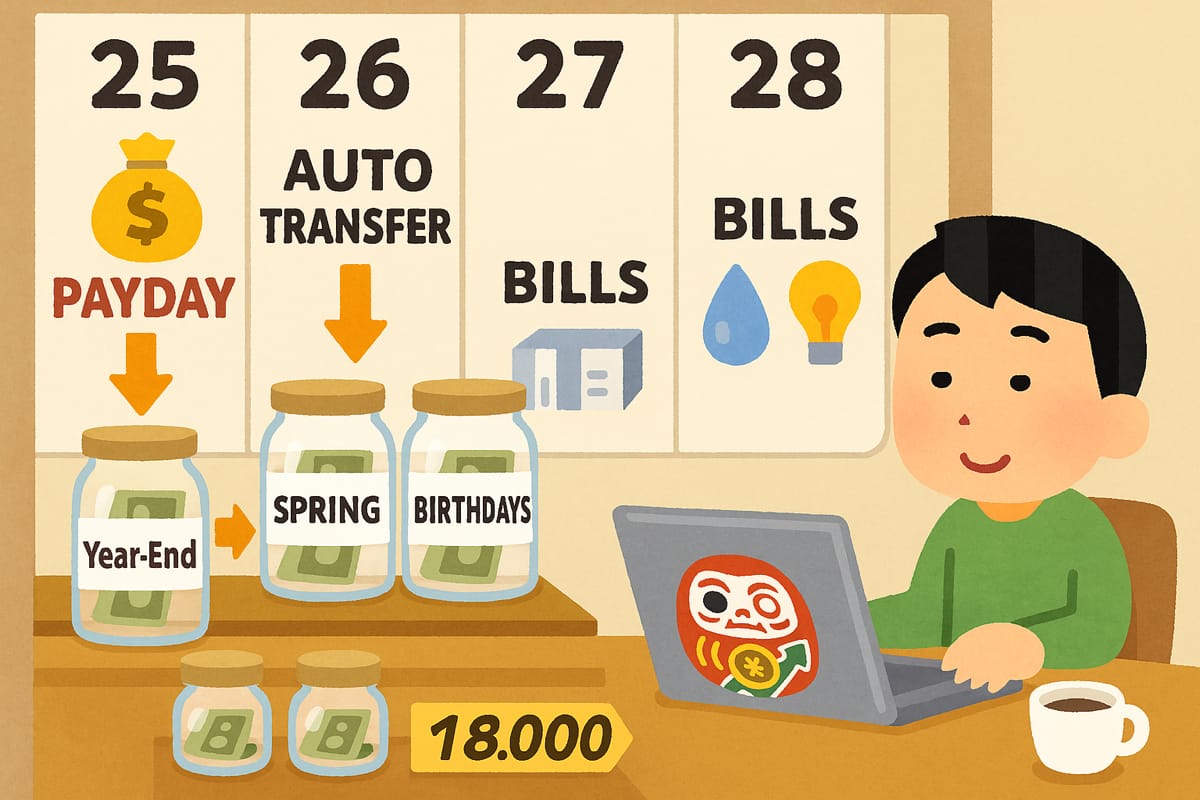 Automate Transfer: Calculate monthly amount. Rolling Fund: seed ¥25,000-30,000, set refill based on next occasion. Target Date: divide largest cluster by months until needed. Set transfer for one day after payday (typically 26th).