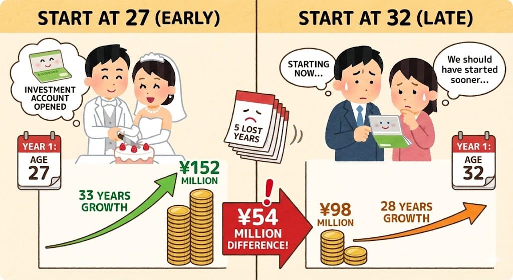 Those five years from 27 to 32 would have compounded for 33 years instead of 28. The difference between 33 years of compounding and 28 years of compounding is ¥54 million on ¥100,000 monthly contributions.