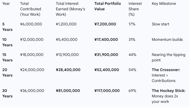 This is why starting early matters so much. Not because you contribute more total yen, but because you give the compounding engine more time to reach the hockey stick inflection point.