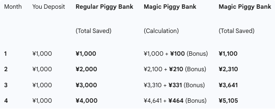 The magic piggy bank has a simple rule: For every ¥1,000 inside it, the bank adds ¥100 at the end of each month.