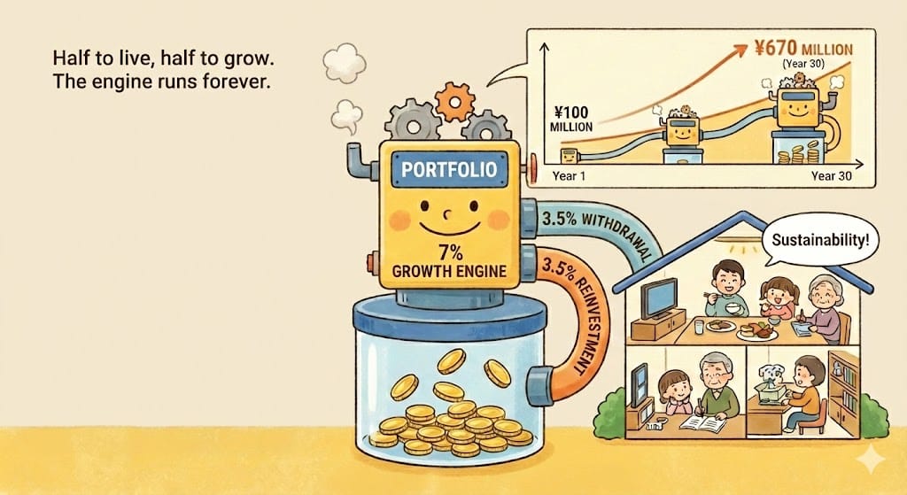 🎨 Image Prompt: irasutoya-style illustration showing portfolio as engine with labeled parts, "7% Growth Engine" producing energy, split into two flows: one pipe showing "3.5% Withdrawal" going to person's household expenses with happy family, other pipe showing "3.5% Reinvestment" cycling back into portfolio base making it grow, background showing portfolio amount increasing from ¥100M to ¥670M over 30-year timeline, engine running continuously with steam/energy symbols, reassuring visualization that withdrawal doesn't deplete portfolio but just redirects half the growth.