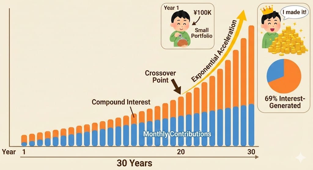The ¥81 million gap is the mechanism. It's dividends reinvesting at current portfolio value, not original value. It's the hockey stick year when interest overtakes contributions. It's the reason 3.5% withdrawal works—the compounding doesn't stop, it just redirects half the growth to your living expenses while the other half keeps the portfolio growing.