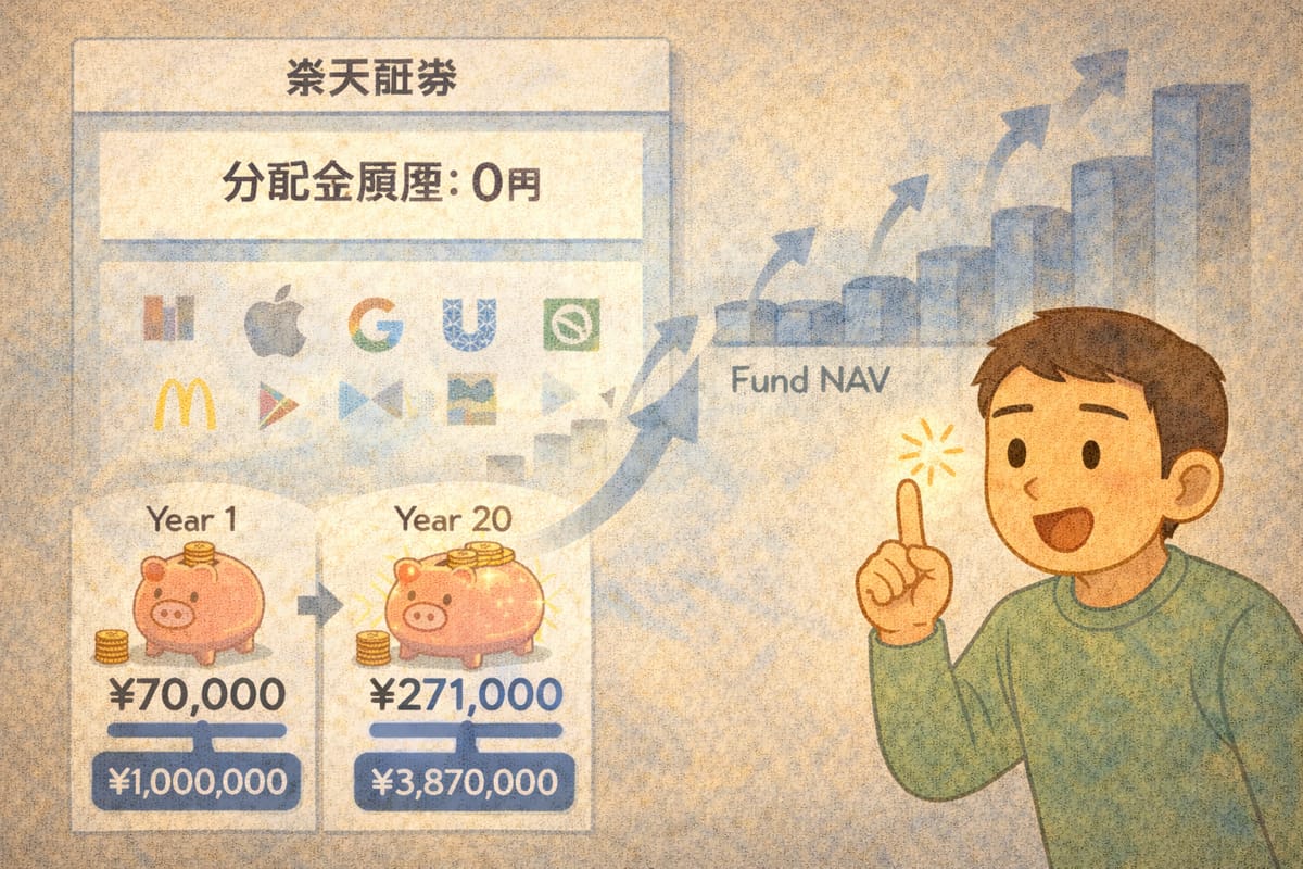 Check your portfolio’s dividend history: Log into Rakuten/SBI Securities, find eMAXIS Slim All Country, look for 分配金履歴. It should say 0円. Confirm that your dividends are reinvesting internally, not being distributed and taxed.